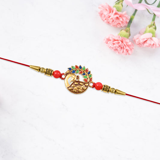 Divine Govind Rakhi With Peacock Feather Design And Multicolor Beads