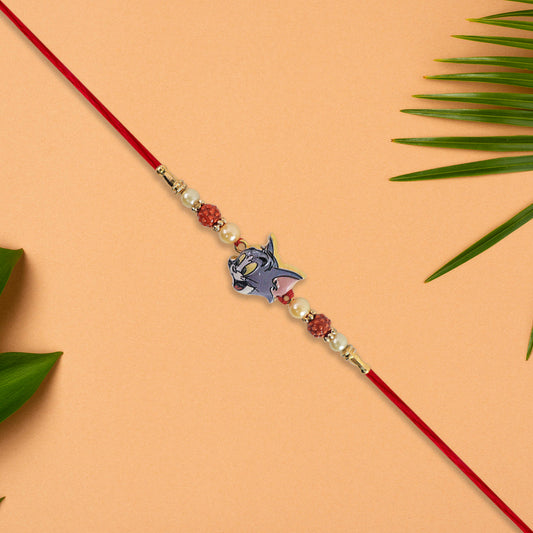Cute Tom Character Rakhi With Rudraksha Pearl Beads On Red Thread