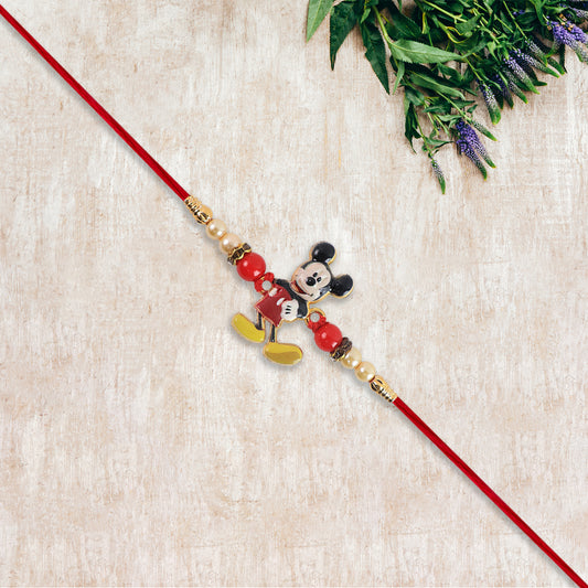 Adorable Mickey Mouse Kids Rakhi With Pearls Golden Beads On Red Thread